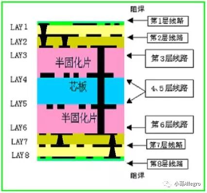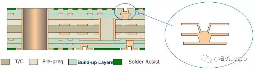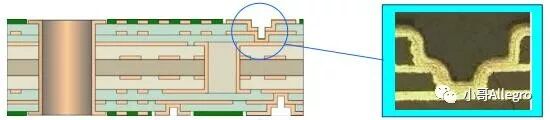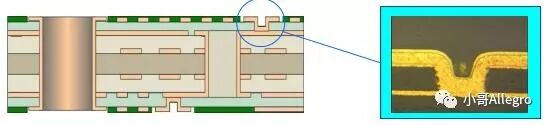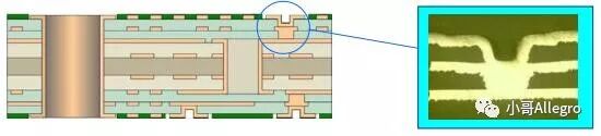 发表时间:2018-01-10 11:41 一.概述: HDI板,是指High Density Interconnect,即高密度互连板,是PCB行业在20世纪末发展起来的一门较新的技术。 传统的PCB板的钻孔由于受到钻刀影响,当钻孔孔径达到0.15mm时,成本已经非常高,且很难再次改进。而HDI板的钻孔不再依赖于传统的机械钻孔,而是利用激光钻孔技术。(所以有时又被称为镭射板。)HDI板的钻孔孔径一般为3-5mil(0.076-0.127mm),线路宽度一般为3-4mil(0.076-0.10mm),焊盘的尺寸可以大幅度的减小所以单位面积内可以得到更多的线路分布,高密度互连由此而来。 HDI技术的出现,适应并推进了PCB行业的发展。使得在HDI板内可以排列上更加密集的BGA、QFP等。目前HDI技术已经得到广泛地运用,其中1阶的HDI已经广泛运用于拥有0.5PITCH的BGA的PCB制作中。 HDI技术的发展推动着芯片技术的发展,芯片技术的发展也反过来推动HDI技术的提高与进步。 目前0.5PITCH的BGA芯片已经逐渐被设计工程师们所大量采用,BGA的焊角也由中心挖空的形式或中心接地的形式逐渐变为中心有信号输入输出需要走线的形式。 所以现在1阶的HDI已经无法完全满足设计人员的需要,因此2阶的HDI开始成为研发工程师和PCB制板厂共同关注的目标。1阶的HDI技术是指激光盲孔仅仅连通表层及与其相邻的次层的成孔技术,2阶的HDI技术是在1阶的HDI技术上的提高,它包含激光盲孔直接由表层钻到第三层,和表层钻到第二层再由第二层钻到第三层两种形式,其难度远远大于1阶的HDI技术。 二.材料: 1、材料的分类 a.铜箔:导电图形构成的基本材料 b.芯板(CORE):线路板的骨架,双面覆铜的板子,即可用于内层制作的双面板。 c.半固化片(Prepreg):多层板制作不可缺少的材料,芯板与芯板之间的粘合剂,同时起到绝缘的作用。 d.阻焊油墨:对板子起到防焊、绝缘、防腐蚀等作用。 e.字符油墨:标示作用。 f.表面处理材料:包括铅锡合金、镍金合金、银、OSP等等。 2、层压的绝缘层材料 2.1 SYE 使用的板材一览表 2.2、HDI 绝缘层材料 2.2.1 SYE HDI绝缘材料一览表 2.3 特殊材料的介绍: HDI绝缘层所使用的特殊材料 RCC : 涂胶膜铜箔(Resin Coated Copper) 涂胶膜铜箔(Resin Coated Copper) 是指将特别的树脂膜层涂在电镀铜箔上。这层膜可以完全覆盖内层线路而成绝缘层. 主要有两种: B stage (Mitsui)和 B+C stage(Polyclad) 特点: *不含玻璃介质层,易于镭射以及等离子微孔成形. *薄介电层. *极高的抗剥离强度. *高韧性,容易操作. *表面光滑,适合微窄线路蚀刻. 涂胶膜铜箔(Resin Coated Copper): 一般来说,HDI 板 的激光钻孔都是在涂胶膜铜箔上面成孔。孔径的形状与一般机械钻孔的孔的形状不完全一样。激光钻孔的孔的形状为一个倒置的梯形。而一般的机械钻孔,孔的形状为柱形。考虑到激光钻孔的能量与效率,镭射孔的孔径大小不能太大。一般为0.076-0.10毫米。 HDI板所需要的其他的材料如:板料;半固化片和铜箔等则没有特别的要求。由于镭射板的电流一般不会太大,所以线路的铜的厚度一般不太厚。内层一般为1盎司,外层一般为半盎司的底铜镀到1盎司的完成铜厚 。板料的厚度一般较薄。并且由于RCC中也仅含树脂,不含玻璃纤维,所以使用RCC的HDI板的硬度/强度一般比同厚度的其他PCB要差。 2.4 目前HDI板的一般结构: 1-HDI Non stacked 2-HDI Stacked But Non Copper filled 2-HDI Stacked & Copper filled 2-HDI 2.5 不同HDI绝缘层材料的效果 这些是不同类型的一阶盲孔切片图(A) RCC FR4(1080) 这些是二阶HDI 盲孔的切片图 RCC FR4 三.流程: 下面我们将以一个2+4+2的8层板为例来说明一下HDI的制作流程: 1.开料(CUT) 开料是把原始的敷铜板切割成能在生产线上制作的板子的过程。 首先我们来了解几个概念: 1. UNIT:UNIT是指客户设计的单元图形。 2. SET :SET是指客户为了提高效率、方便生产等原因,将多个UNIT 拼在一起成为的一个整体图形。它包括单元图形、工艺边等等。 3. PANEL:PANEL是指PCB厂家生产时,为了提高效率、方便生产等原因,将多个SET拼在一起并加上工具板边,组成的一块板子。我们采购回来的大料有以下几种尺寸:36.5 INCH × 48.5 INCH、40.5 INCH × 48.5 INCH 、42.5 INCH × 48.5 INCH 等等。 作为PCB设计的工程师与设计的工程师与PCB 制作的工程师,利用率是大家共同关注的问题。 2.内层干膜:(INNER DRY FILM) 内层干膜是将内层线路图形转移到PCB板上的过程。 在PCB制作中我们会提到 图形转移这个概念,因为导电图形的制作是PCB制作的根本。所以图形转移过程对PCB制作来说,有非常重要的意义。 内层干膜包括内层贴膜、曝光显影、内层蚀刻等多道工序。内层贴膜就是在铜板表面贴上一层特殊的感光膜。这种膜遇光会固化,在板子上形成一道保护膜。曝光显影是将贴好膜的板将进行曝光,透光的部分被固化,没透光的部分还是干膜。然后经过显影,褪掉没固化的干膜,将贴有固化保护膜的板进行蚀刻。再经过退膜处理,这时内层的线路图形就被转移到板子上了。 对于设计人员来说,我们最主要考虑的是布线的最小线宽、间距的控制及布线的均匀性。因为间距过小会造成夹膜,膜无法褪尽造成短路。线宽太小,膜的附着力不足,造成线路开路。所以电路设计时的安全间距(包括线与线、线与焊盘、焊盘与焊盘、线与铜面等),都必须考虑生产时的安全间距。 3.黑化和棕化:(BLACK OXIDATION) 黑化和棕化的目的 1. 去除表面的油污,杂质等污染物; 2. 增大铜箔的比表面,从而增大与树脂接触面积,有利于
